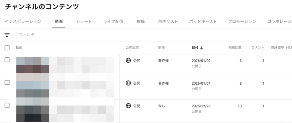 - チャンネル登録者0、高評価・コメント0、視聴回数全て10回以下